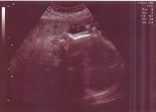 This is a profile shot of baby Harrell. Interestingly enough it gets harder to get good images and look at internal organs as the baby develops. Skeletal structures interfere with the ultrasound. This was taken on June 17, 2004.